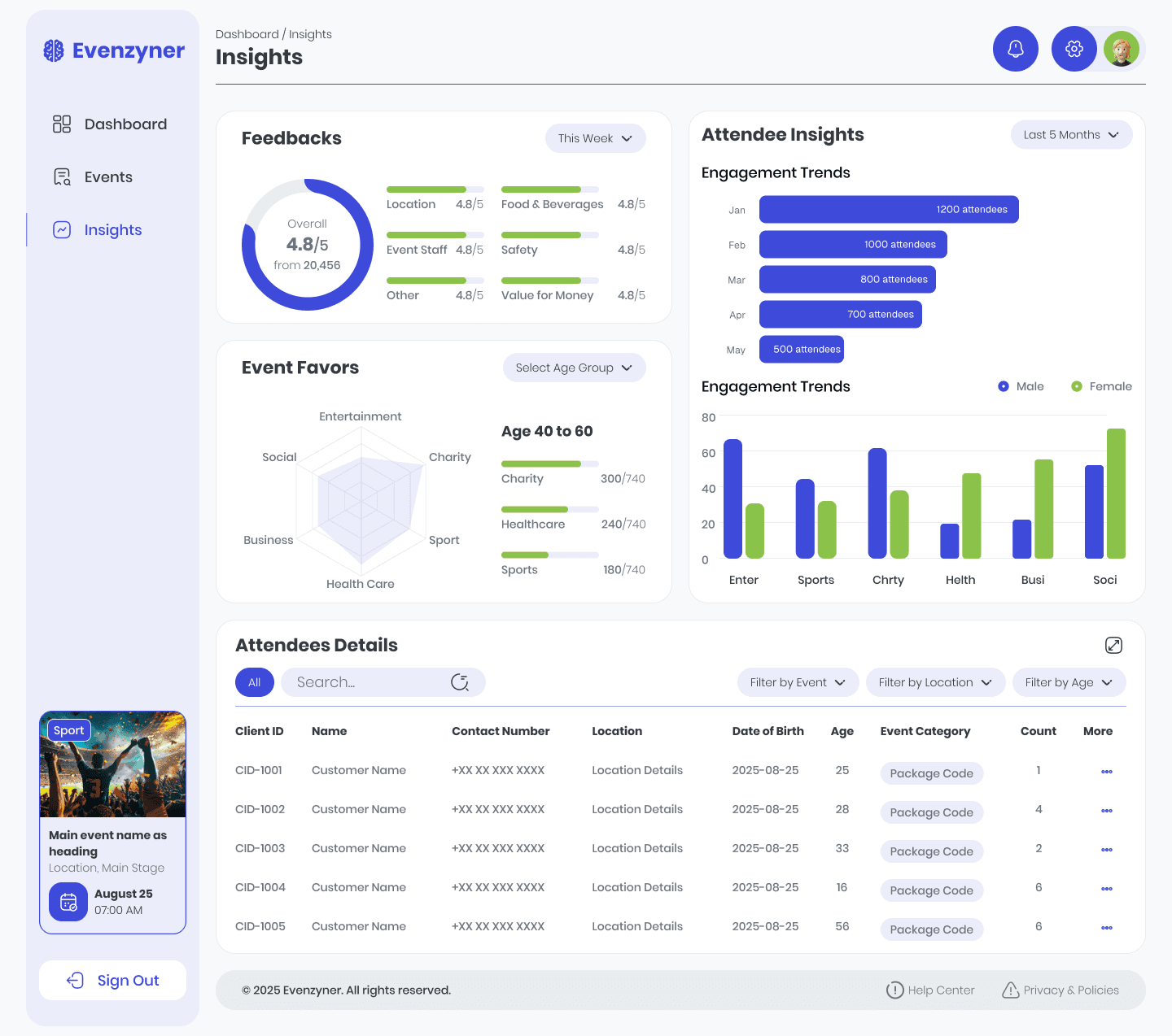 Eventzyner is a web-based dashboard that helps event organizers manage events, track bookings and ticket sales, monitor attendee insights, and make data-driven decisions. The dashboard provides an Overview (high-level metrics and notifications), Browse Events (discover & filter events), Event Details (bookings, revenue, seating), and Attendee Insights (demographics & engagement). The attached design shows the finished screens and visual system used across the product.